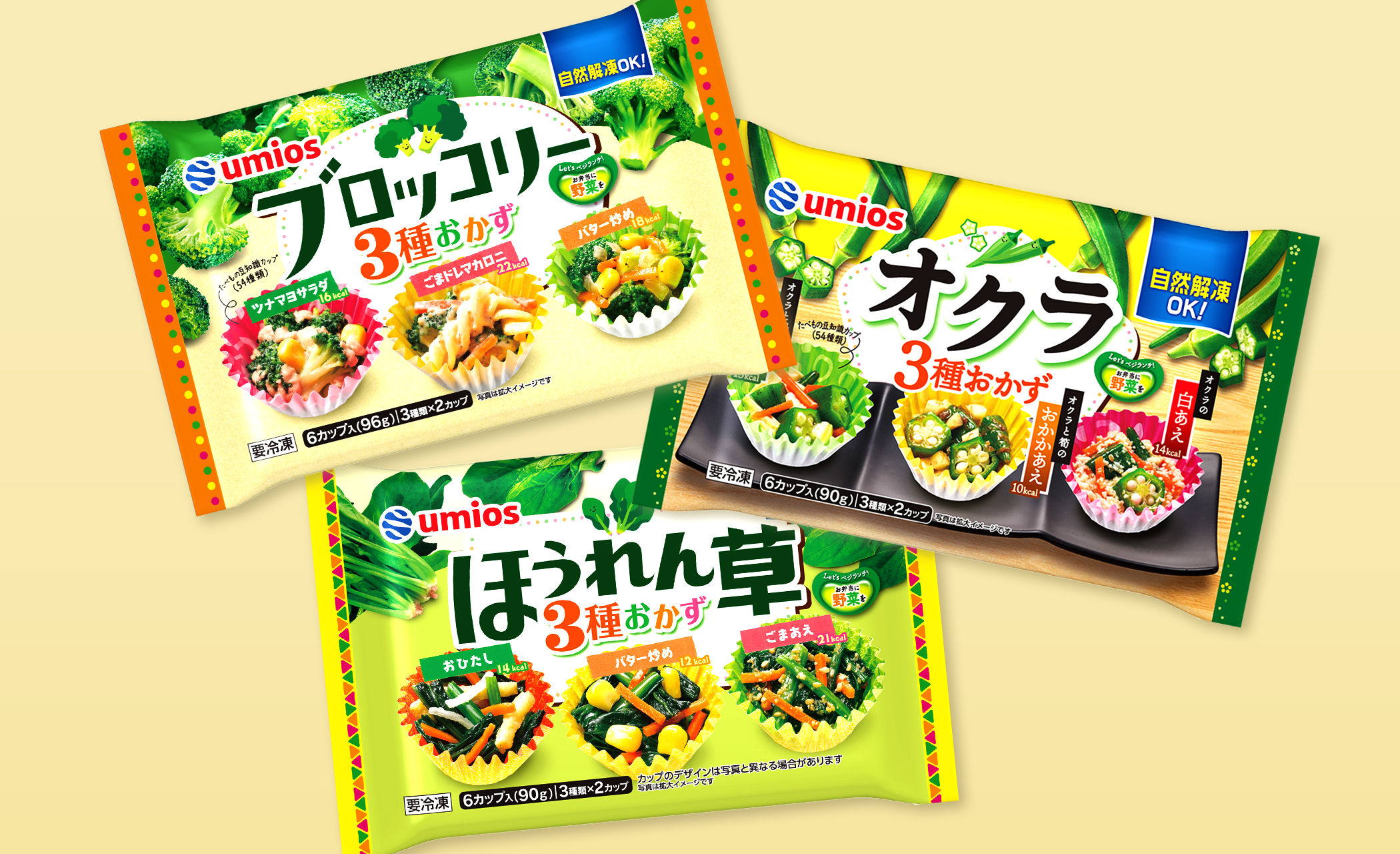 お弁当に入れるだけで野菜が摂れ、彩り豊かに食べられる野菜のおかずシリーズ。主役の野菜をメインに味付けが異なる惣菜が3種類アソートカップで入っており毎日に取り入れやすい商品です。「ブロッコリー3種おかず」から始まり、ほうれん草3種おかず、オクラ3種おかずと発売されているロングセラー商品になります。 デザインも美味しく楽しく野菜を食べられる製品として、可愛らしい品名と野菜のキャラクター、ポイントでカラフルな要素を入れたり親しみやすい世界観のビジュアルにしました。オクラは少し大人向けの素材のためシリーズ感は担保しつつ、落ち着いた印象で作成しました。上部は素材の写真をごろごろと入れ、主役の野菜がわかりやすく表現しています。